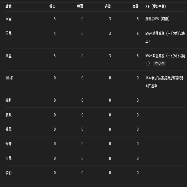 テーマB:消費税減税(時限措置の“法案提出”が確認できるもの)