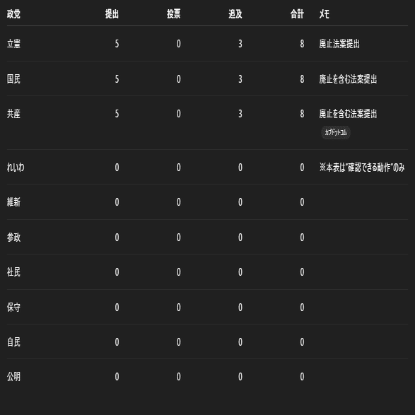 ※このテーマは、ここで挙げた各法案について採決(投票)が確認できるものではないため、投票は全党0。